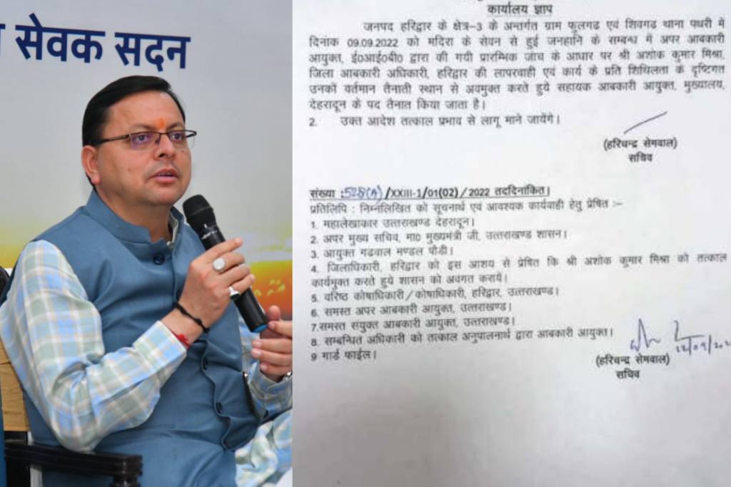 अशोक मिश्रा को हटाए जाने के आदेशों में सचिव आबकारी हरीश चंद सेमवाल ने लिखा है की हरिद्वार जिले में कामकाज में आप जिला आबकारी अधिकारी द्वारा लापरवाही बरती गई है अशोक मिश्रा को हटाते हुए आपकारी मुख्यालय अटैच कर दिया गया है जबकि जिला आबकारी अधिकारी हरिद्वार के पद पर भी किसी की तैनाती नहीं हुई है घटना के बाद से ही इस मामले को रफा दफा करने या मिनी माइज करने के भी प्रयास जमकर हुए थे लेकिन मुख्यमंत्री धामी की नाराजगी के सामने फिर किसी की नही चल सकी