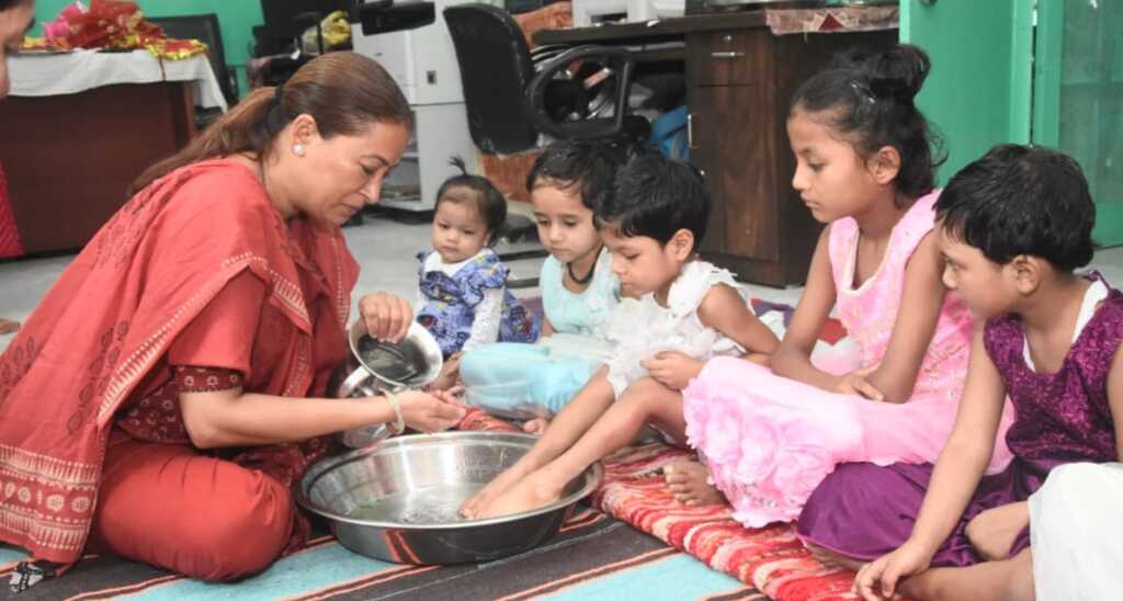 देहरादून। केदारपुरम स्थित राजकीय बालिका निकेतन में महिला सशक्तिकरण एवं बाल विकास मंत्री रेखा आर्या ने नवरात्रि के पावन पर्व पर कन्याओं का कंजक पूजन किया। उन्होंने नन्हीं कन्याओं के चरण पखारकर उनका पूजन किया और उनके साथ बैठकर भोजन ग्रहण किया।